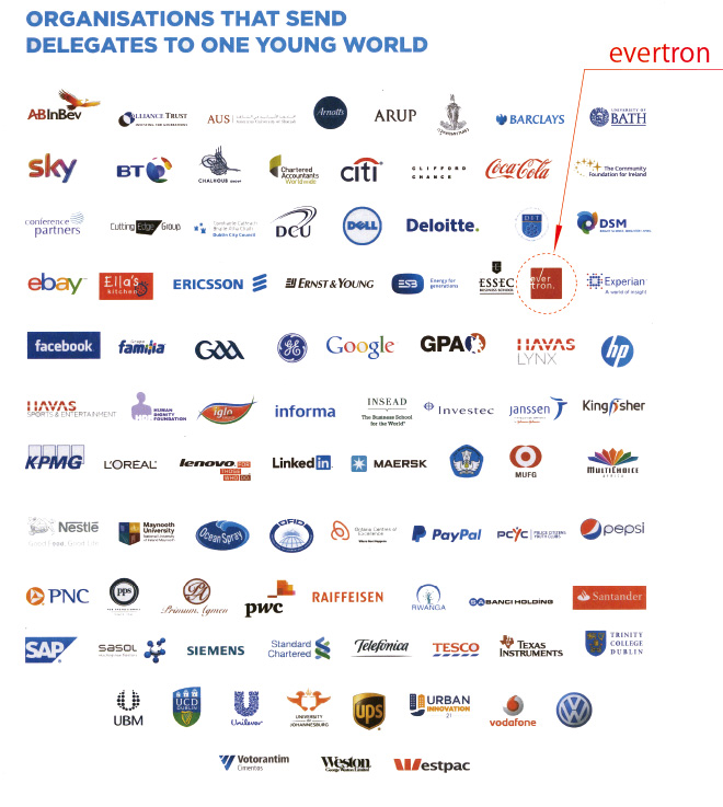 Leaders from around the world gather annually and take on counselling roles. (Previous summits have included former U.N. Secretary General Kofi Annan, former U.S. President Bill Clinton, the president of Barclays Bank, and the heads of such firms as L’Oréal, Virgin Group, KPMG and Unilever.) Through its participation in the One Young World initiative, the evertron Group is helping support young people as they step out into the international community.
